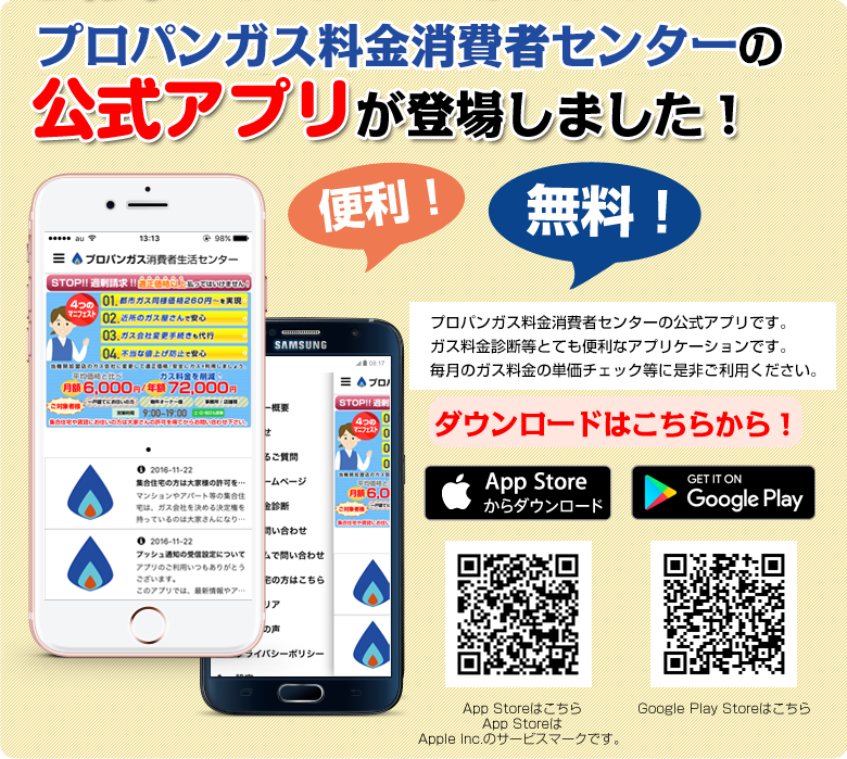 プロパンガス料金消費者センターの公式アプリは無料です! 下記、2次元コードからダウンロードして下さい。 (ボタンをクリックしてもダウンロードページに移動します。)